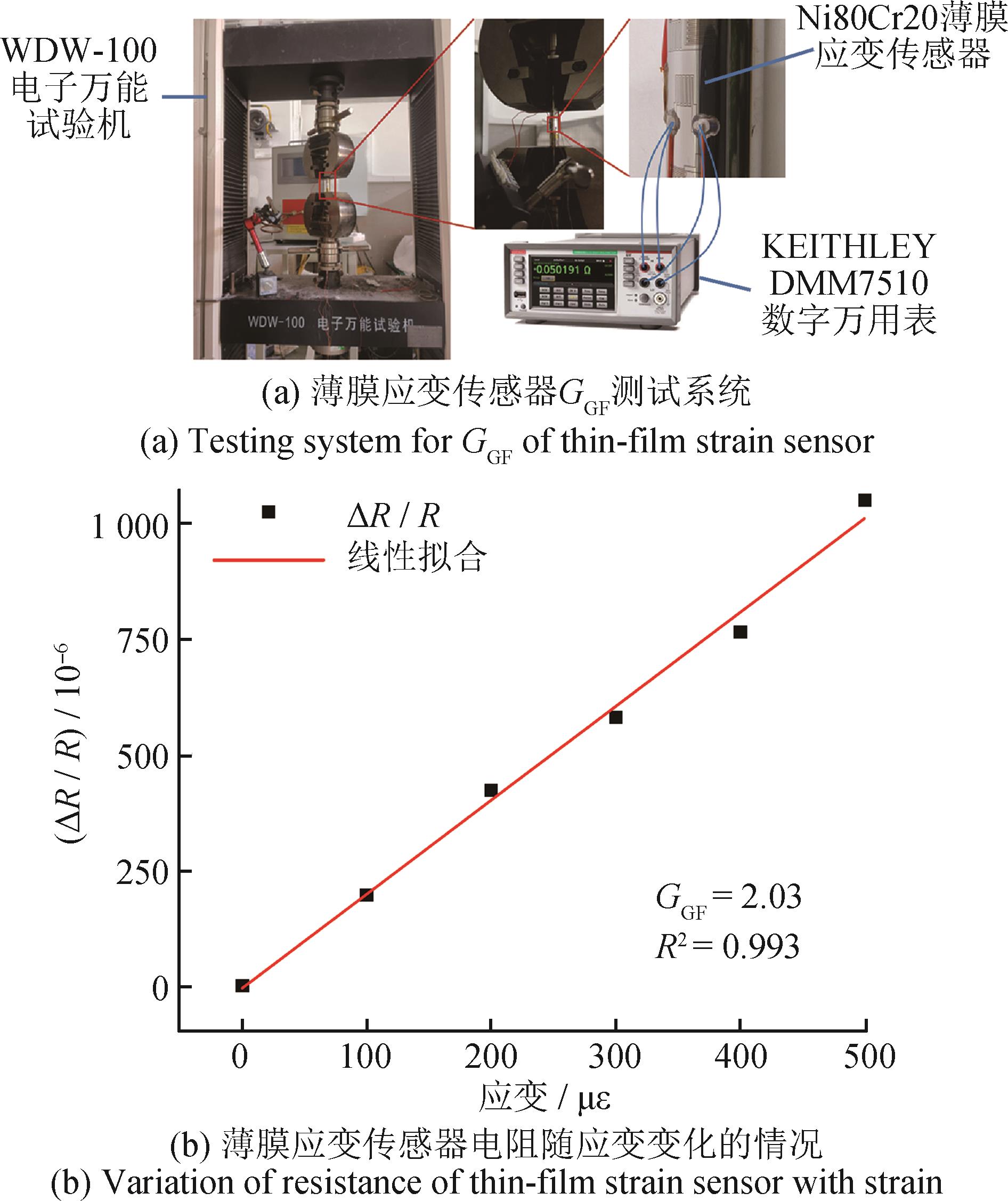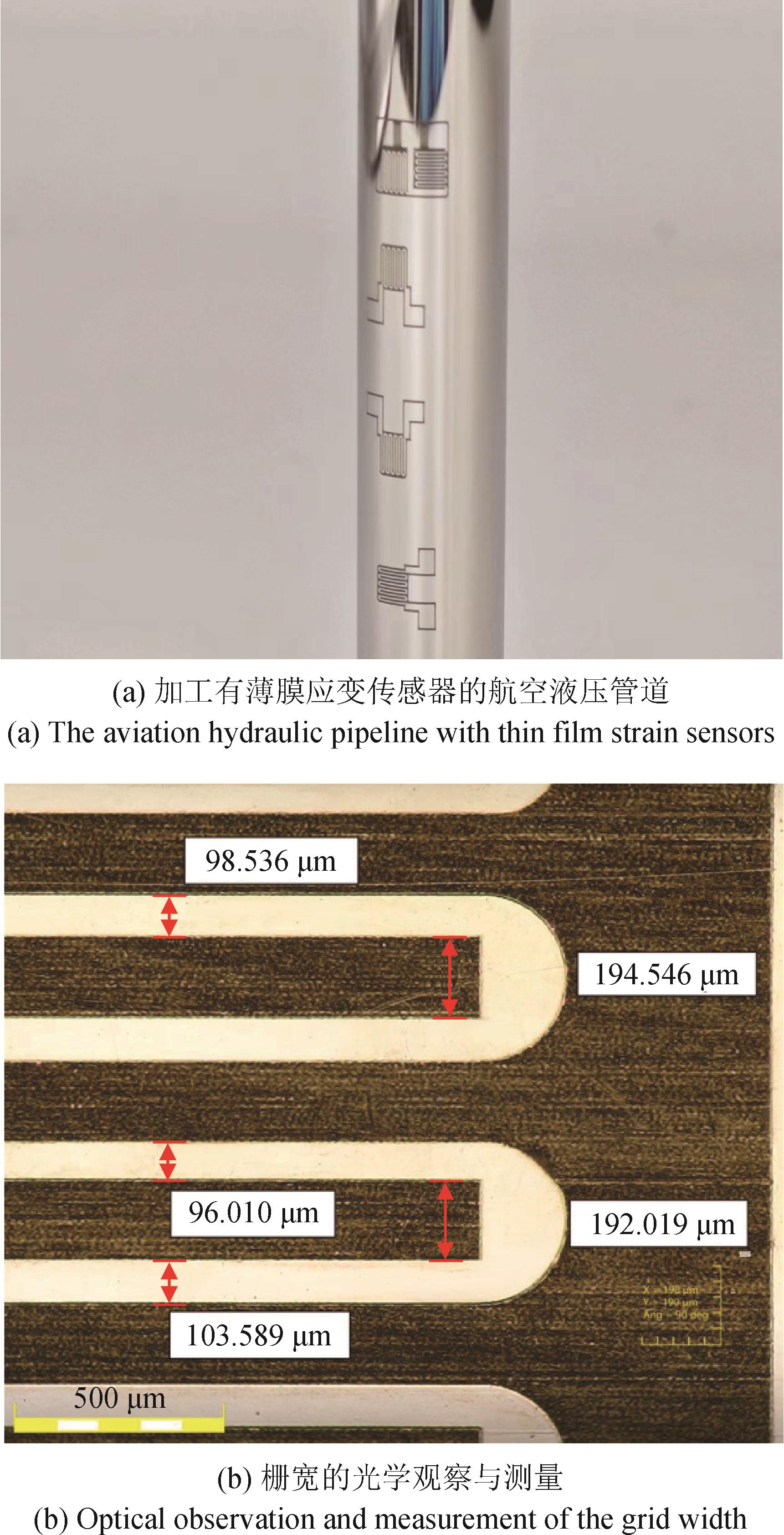 摘要:传统应变片在监测过程中存在应变传递误差大、响应慢等问题,严重制约了工程应用效能。针对航空液压管道应变、振动、卡箍松动等状态的实时监测需求,提出了一种在航空液压管道上原位制备薄膜应变传感器的方法。建立基底与应变丝栅敏感层之间的应变传递误差有限元分析模型,优化设计电阻应变栅的结构参数;采用磁控溅射技术制备Ni80Cr20应变敏感层等多层异质薄膜,通过五轴联动激光刻蚀工艺,实时调控激光入射角与焦点位置,实现对功能材料刻蚀深度的高精度控制。测试结果表明:在-40 ~ 100 ℃条件下,制备的薄膜应变传感器电阻漂移率DDR为8.4 × 10-5 h-1,电阻温度系数TTCR为1.3 × 10-4-1;在0 ~ 500 με应变条件下,该传感器的应变灵敏系数GGF为2.03,响应时间仅为15 ns。通过力锤实验等验证了该一体化制造传感器对航空液压管道实时应变、振动、卡箍松紧程度等关键信息的检测与识别能力,该传感器在航空液压管道状态监测领域具有广阔应用前景。
