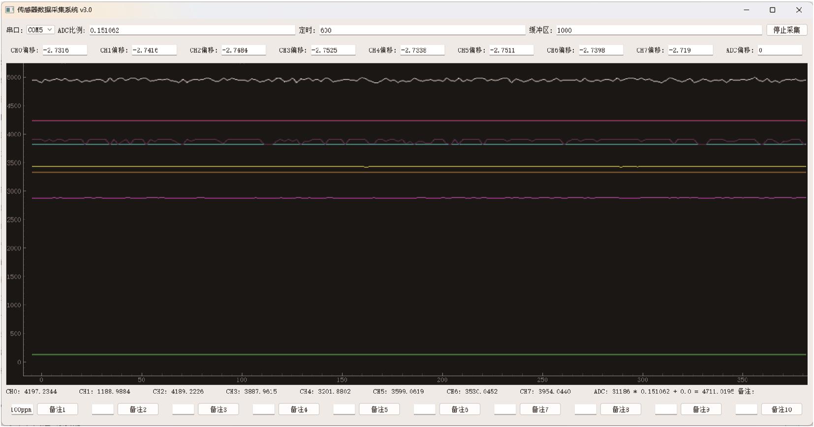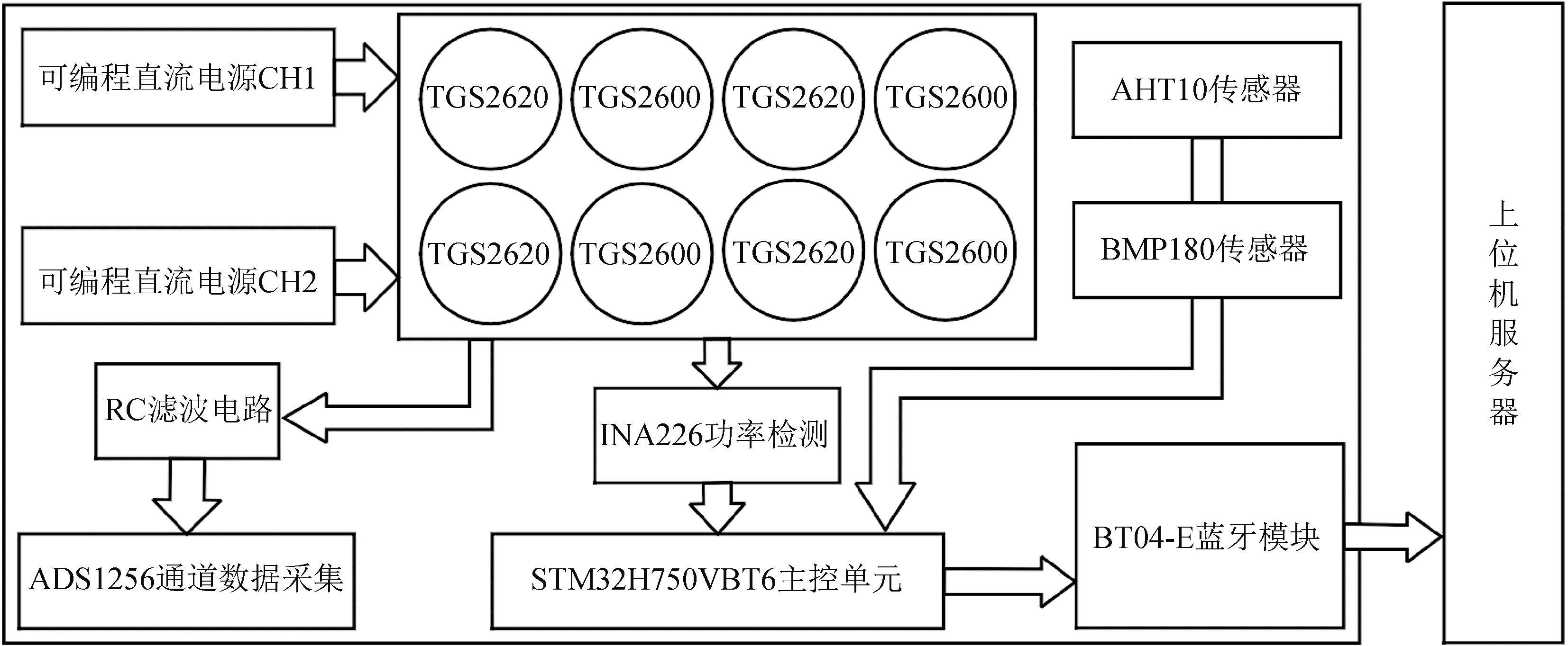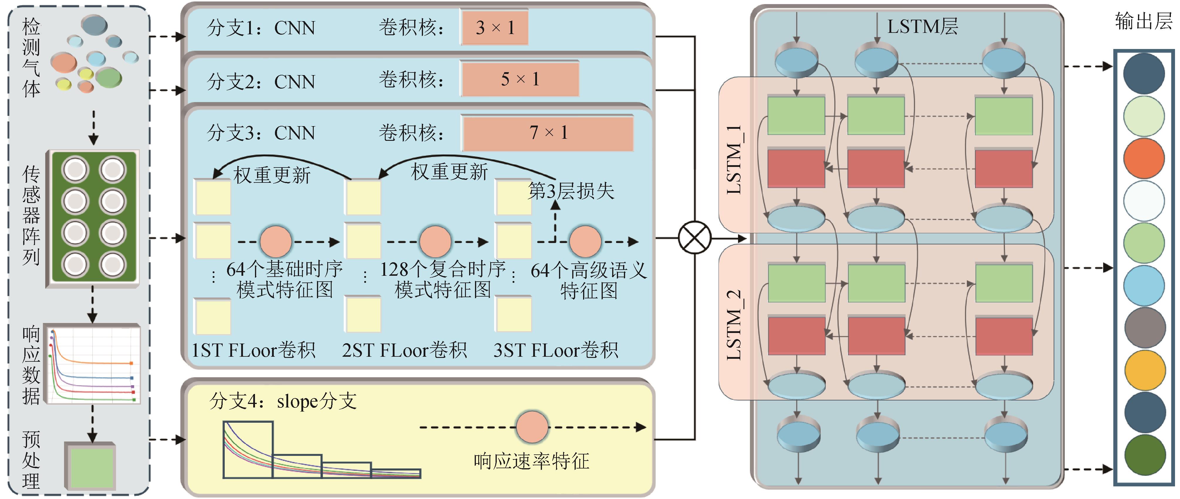 摘要:针对复杂环境下多组分气体的检测需求,设计并实现了一种基于金属氧化物半导体的便携式多通道气体检测系统。系统集成8路传感器阵列、高精度信号采集链路及低功耗硬件,并结合多分支卷积神经网络与双向长短期记忆网络实现多通道信号的自动特征提取与时序建模。以CO、C2H5OH及其干扰和混合气体为研究对象开展实验,结果表明:系统对被检测物的不同浓度区间均表现出良好的线性响应与高检测精度。对比实验进一步验证了多传感器融合策略在提升识别准确率、增强鲁棒性及适应复杂环境方面的有效性,其中混合气体识别准确率最高达100%。本研究为环境监测、工业安全及公共健康领域的多组分气体检测提供了可靠的技术支撑与实践依据。